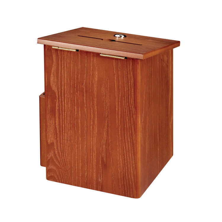 The AdirOffice Square Wood Suggestion Box is constructed of durable, medium-density fiberboard wood to provide long-lasting strength. The box is outfitted with a locking hinged lid to ensure that items inside are safe and secure and it comes with 2 keys for quick and easy access inside. Stylish and practical, the AdirOffice Suggestion Box features a wide slot on top to accommodate ballots, mail, money or checks and features a side pocket to conveniently store blank forms, notepads or suggestion cards. A pen with a chain and adhesive mount are also included with the box, allowing you to attach it near the box for added convenience. To finish it off, this wood box is equipped with pre-drilled holes and screws for quick and easy mounting onto any wall. Or, you can simply place it on any flat service, such as a counter, table or desk. Color(s): Medium Oak; Width: 7.25"; Height: 10"; Depth: 7.5".
