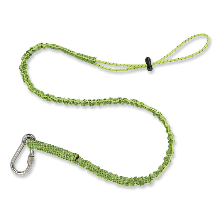 Squids 3101 Lanyard with Stainless Steel Carabiner + Cinch-Loop features an energy-absorbing cord with tubular-nylon webbing and lock-stitching at both ends for reliable, secure performance throughout its listed stretch range. A manual-locking, corrosion-resistant stainless steel carabiner on one end enables easy, secure attachment to either anchor points or tools, and its captive-eye attachment design helps the user to better predict the direction of the load, keeping the potential for the lanyard to slide into the carabiner's gate minimal. A cinch-loop at the other end of the lanyard allows for tethering to either captive-hole attachment-equipped tools and/or to the user's wrist. Reflective accents along the cord's length help improve visibility in low-light conditions. These tool lanyards are built to withstand defined weight limits and can easily be used by any worker to help avoid accidentally dropping objects that could cause damage or serious injuries. Third-party certified to an 15 lb maximum working capacity with a 2:1 safety factor, these lanyards are ideal for a wide range of industry applications including construction, telecommunications, petro-chemical operations, utility-line maintenance and a variety of other areas where working at heights is the norm. Extended Length—Stretches from 42" to 54" long. Fastener Style: Carabiner; Cinch-Loop; Lanyard Color(s): Lime; Length: 42" to 54"; Safety Breakaway Connector: No.