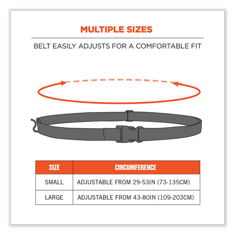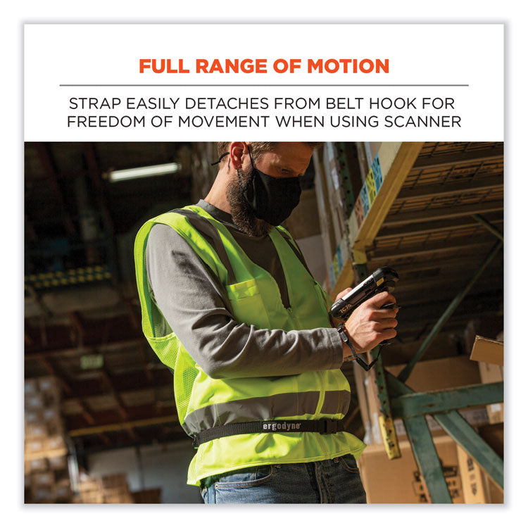 The Squids 3135 Barcode Scanner Belt with Hook is designed for use with Squids 3136 Barcode Scanner Adaptor Straps (one included) to keep barcode and QR scanners secure and accessible during warehouse and distribution work. This industrial-grade scanner belt is built with a heavy-duty webbing strap and ultra-durable buckles that withstand the harshest environmental conditions. Simply thread a scanner adaptor strap through the small captive hole built into most cordless scanners, and then hang the adapter strap on the belt's handy hook to keep your scanner secured to your hip, at the ready. Modular format allows the user to easily switch out scanners for any equipped with a Squids 3136 Adaptor Strap (additional straps sold separately). Curved cinch-buckle fits comfortably against the wearer's waist for all-day wearing comfort. Hand wash with mild soap and water and then air dry. Large—Adjusts from 48" to 80" in length. Fastener Style: Hook; Loop; Lanyard Color(s): Black; Length: 48" to 80"; Safety Breakaway Connector: No.