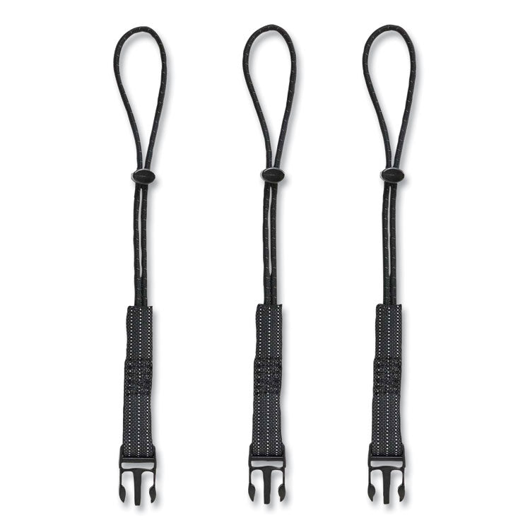 Central to the Squids 3192 Wrist Lanyard Tethering Kit is the 3116 Pull-On Wrist Lanyard with Buckle. This handy lanyard features a one-size-fits-all format and elastic-material construction to ensure a snug, secure fit for all users. Modular quick-connect buckle allows the wearer to easily attach any compatible tool-tail equipped item, and the included Squids 3103 Detachable Tool Tail Cinch-Loops make it easy for you to set up several tools for easy exchanges. Since connection points for tool lanyards are not always readily available on hand tools, which can create a hazardous environment while working at heights if the issue is ignored, this kit also includes the Squids 3755 Self-Adhering Tool Trap to help you ensure your retrofitted tool connections are secure. Kit is third-party tested to a maximum safe-working capacity of 3 lb with a 2:1 safety factor. Fastener Style: Buckle; Lanyard Color(s): Black; Length: 7.5"; Safety Breakaway Connector: No.