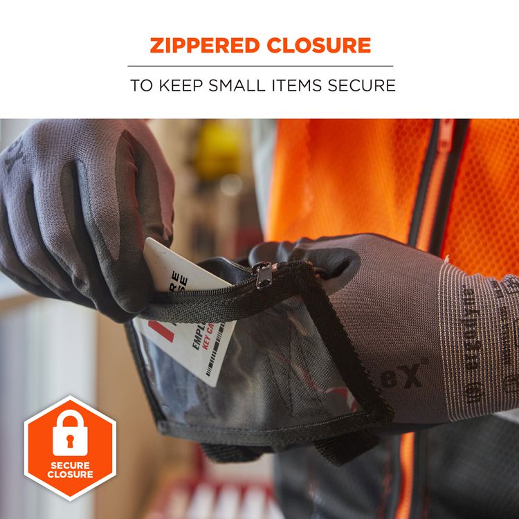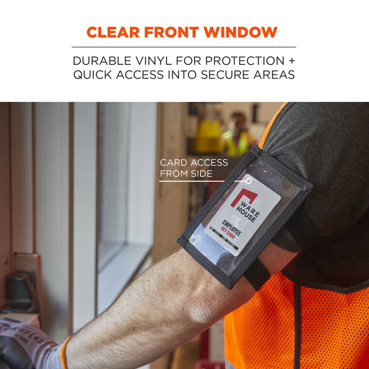 Squids 3387 Dual Band Arm ID/Badge Holder with zipper closure is designed for easy access and prevention of lost IDs and badges. A dual elastic band with hook and loop closures adjusts to fit a range of arm sizes or over bulky outwear, while a large interior pocket keeps both IDs/badges and small items secure, such as keys, EZ passes and money. The large clear window is made with durable vinyl for protection and long-lasting use. This arm band holder fits most ID badges or access cards measuring 4.75" x 2.75". Orientation: Vertical; Name Badge Holder Length: 5.75"; Name Badge Holder Width: 3.75"; Name Badge Holder Color(s): Black.