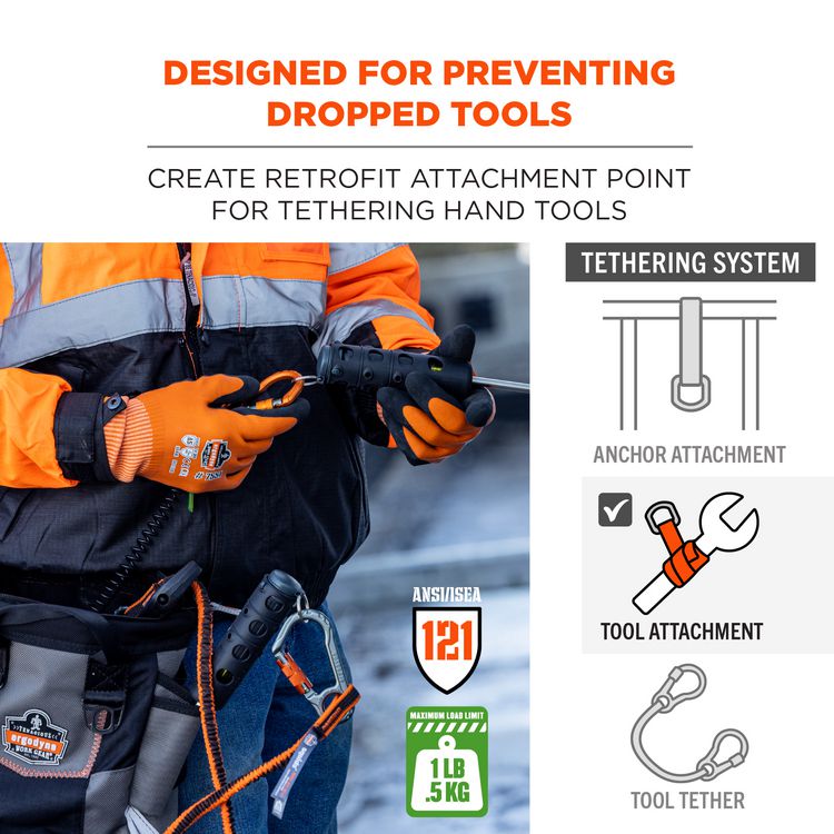 The Squids 3745 Tool Grip and Tether Attachment Point installs onto screwdrivers and nut drivers to create a retrofit attachment point for tethering tools up to 1 lb, preventing dropped or falling objects from occurring on the job. Connection points for tool lanyards can be tricky to find, especially on smaller hand tools like screwdrivers and nut drivers. While working at heights, it is important to tether tools as part of your overall fall protection plan, but the lack of these connection points can make that difficult. Designed in two pieces, this tool attachment features an end cap and a rubber sleeve. To install, slide a screwdriver or nut driver into the rubber sleeve and plug the end cap's pegs into the reinforced holes of the rubber sleeve. The sleeve features a textured rubber and is ergonomically designed to cover the entire tool handle—providing greater comfort, torque and an enhanced grip. Fastener Style: Ring; Lanyard Color(s): Black; Length: 5.5"; Safety Breakaway Connector: No.