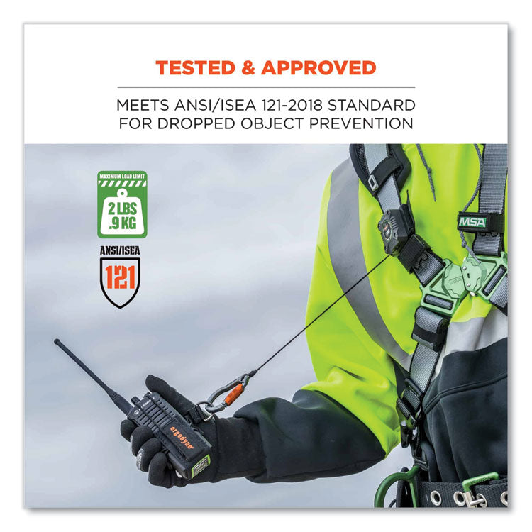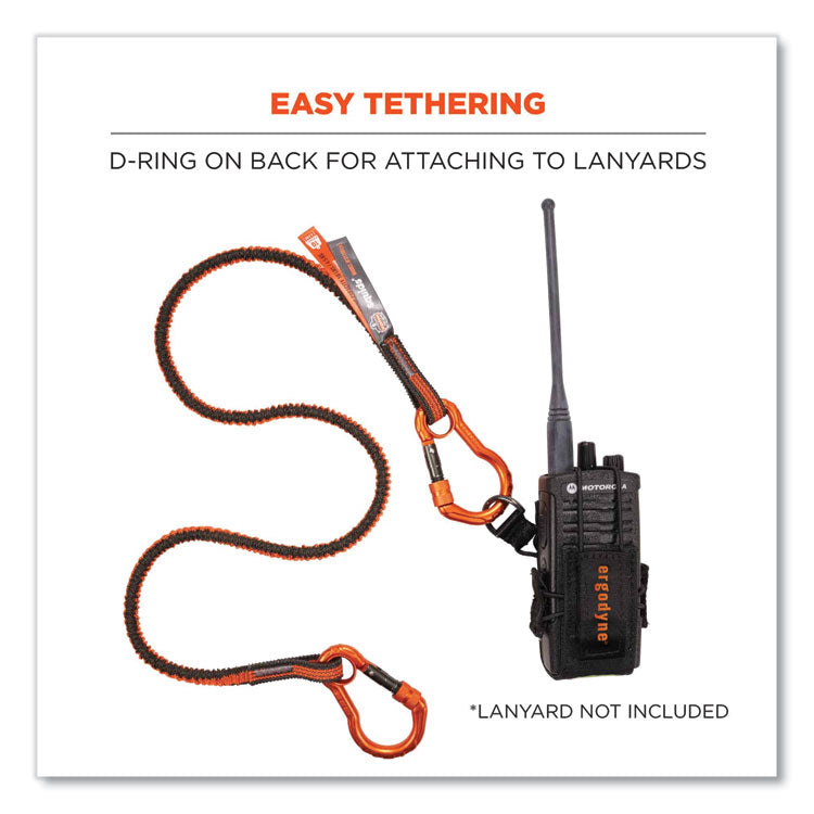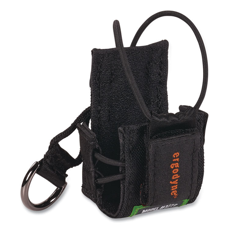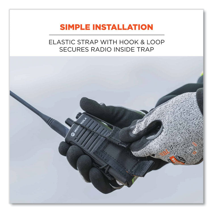 The Squids 3772 Radio Holster Trap is the safest way to keep cordless radios secure and accessible while working at heights. This easy-to-use holster acts as an all-in-one attachment point for tethering cordless radios to a tool lanyard, decreasing the drop and break risks of expensive communication devices. With rugged polyester construction and heavy-duty elastic hook and loop straps, this radio holster trap protects radios in even the harshest worksite conditions. It features a zinc-plated cast alloy D-Ring on the back for securely attaching to a tool lanyard. Large--Fits radios 1.5" w x 2" l x 5" h. Safe working capacity: 2 lb. HTO Type: Holster; Material(s): Polyester; Color(s): Black; Width: 1.5".