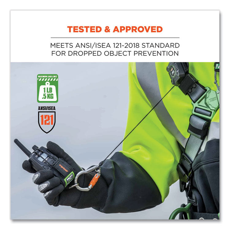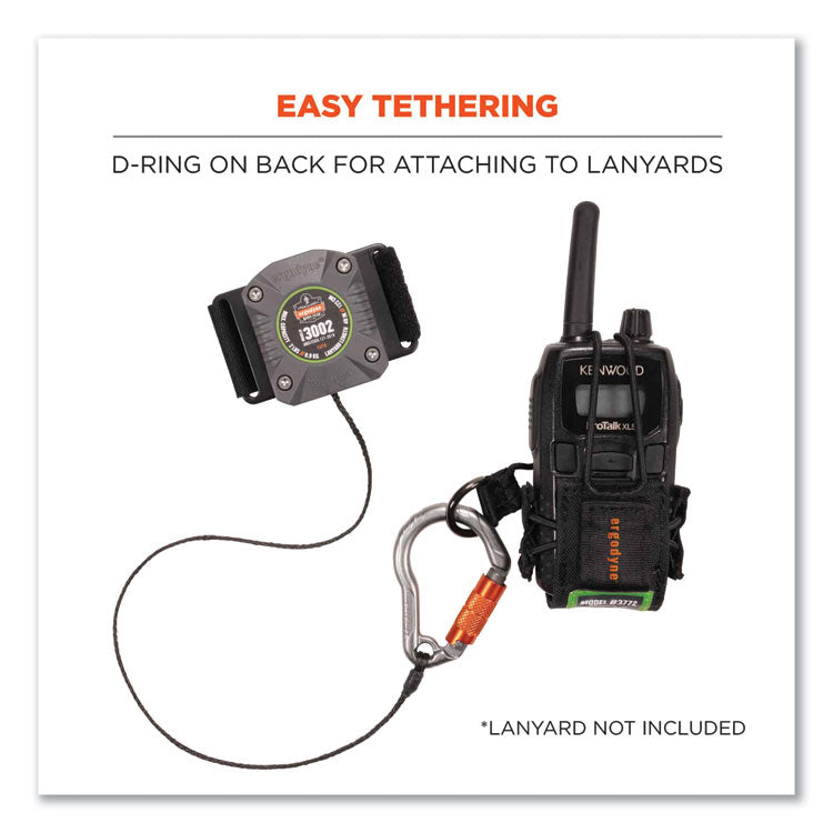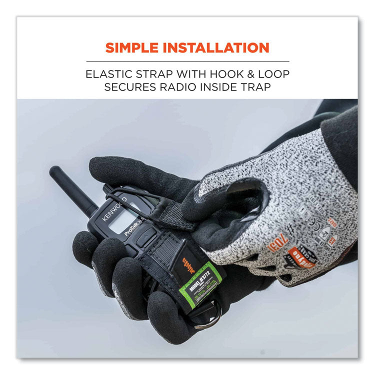 The Squids 3772 Radio Holster Trap is the safest way to keep cordless radios secure and accessible while working at heights. This easy-to-use holster acts as an all-in-one attachment point for tethering cordless radios to a tool lanyard, decreasing the drop and break risks of expensive communication devices. With rugged polyester construction and heavy-duty elastic hook and loop straps, this radio holster trap protects radios in even the harshest worksite conditions. It features a zinc-plated cast alloy D-Ring on the back for securely attaching to a tool lanyard. Small--Fits radios 1" w x 2" l x 4" h. Safe working capacity: 1 lb. HTO Type: Holster; Material(s): Polyester; Color(s): Black; Shape: Round.