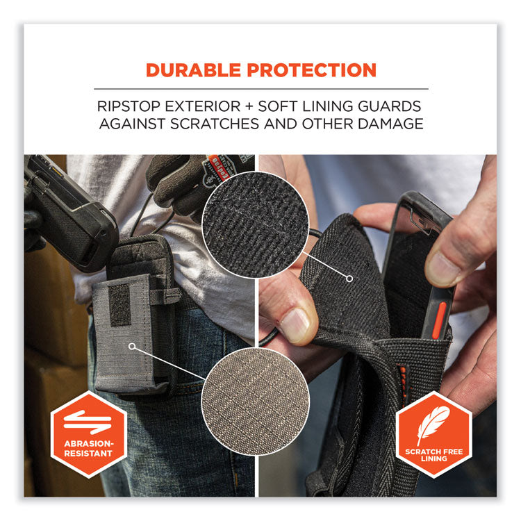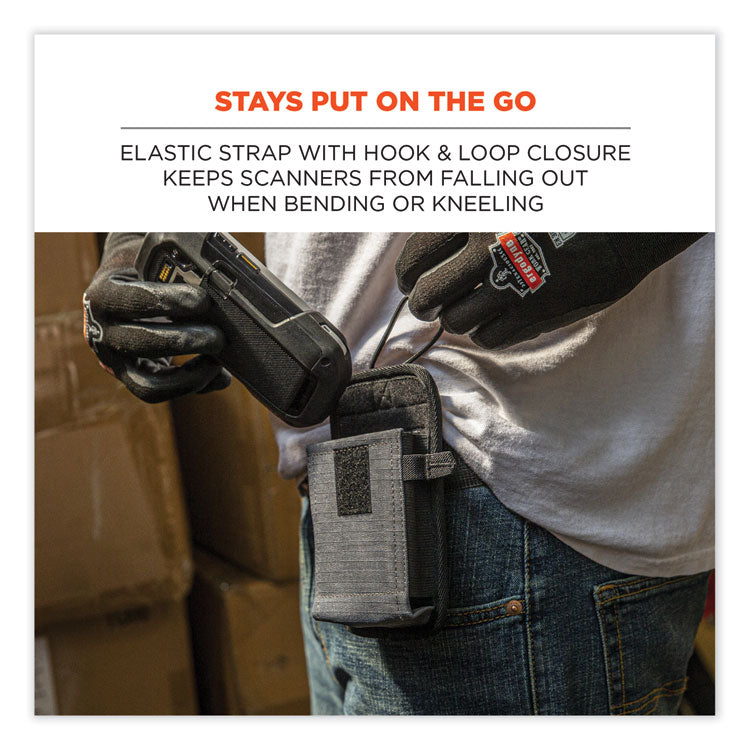 The Squids® 5542 Phone Style Barcode Scanner Holster with Belt Loop prevents costly drops or losses by keeping handle-less barcode scanners, mobile computers and even cell phones securely stored and conveniently accessible. With an easy-to-attach belt loop, the holster slides over and secures around belts without having to remove them. Unlike standard belt clips, the loop design also makes it possible to securely attach scanners to carts, equipment or fixtures. Built with abrasion-resistant ripstop polyester for work in the harshest environments, plus a fleece lining for protection from scratches. This barcode scanner holster is designed for convenient use with candy bar style scanners that do not have a handle. An elastic strap with hook-and-loop closure plus snug elastic sides ensure devices remain securely stored whether the holster is worn vertically or horizontally. Small—Fits scanner faces 3.5" x 1". HTO Type: Holster; Material(s): Polyester; Color(s): Black; Width: 3.75".
