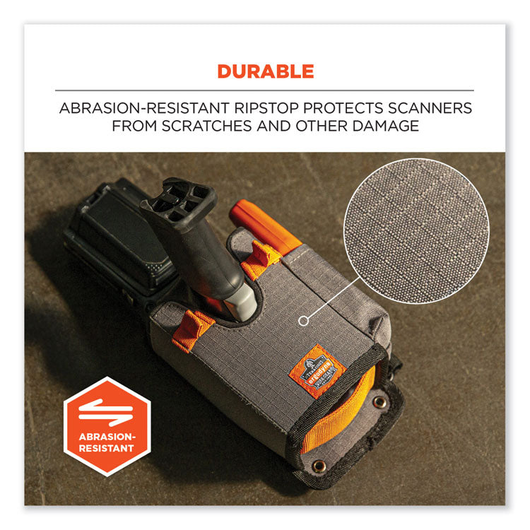 The Squids® 5543 Barcode Scanner Holder Mount with Fastener Straps prevents costly drops or losses by securing barcode scanners to the worksite for convenient storage and access. With two easy-to-attach hook-and-loop fastener straps and grommets, this forklift scanner holder has multiple attachment methods for securing to forklifts, table legs, shelves and more. Built with abrasion-resistant ripstop polyester for work in the harshest environments. For quick access to more than just scanners, this worksite holder also features two pockets and two elastic loops for markers, box cutters and other small hand tools. Large—Fits scanner faces 3.5" x 3". HTO Type: Holster; Material(s): Polyester; Color(s): Gray; Width: 3.5".