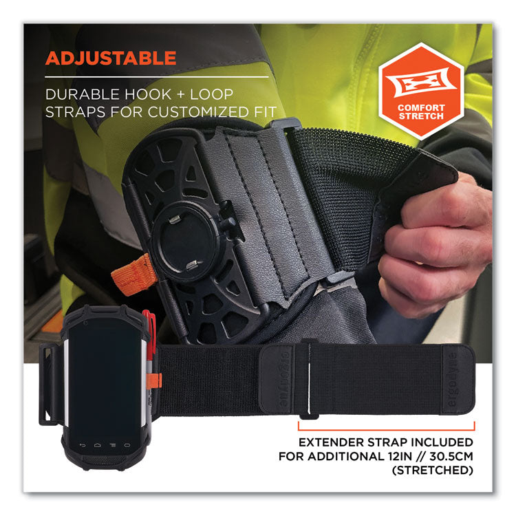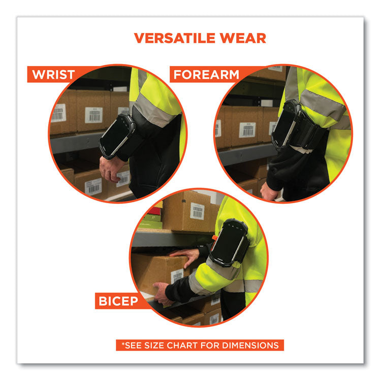 The Squids 5545 Arm and Wrist Scanner Mount prevents costly drops or misplaced devices by keeping handle-less barcode scanners, mobile computers and cell phones securely stored and conveniently accessible. Designed to be worn anywhere on a user's arm (wrist, forearm or upper arm) the scanner holder swivels 360° and offers complete access to all buttons and controls in either portrait or landscape mode. The scanner holder is built with snug and flexible elastic sides to accommodate a variety of scanner sizes. The arm band is built with high-quality elastic that is breathable and lightweight for all-day comfortable wear. An elastic accessory slot is built into the band to hold stylists, pens, pencils or small cutting tools. Large. HTO Type: Scanner Mount; Material(s): Elastic; Color(s): Black; Shape: Rectangular.