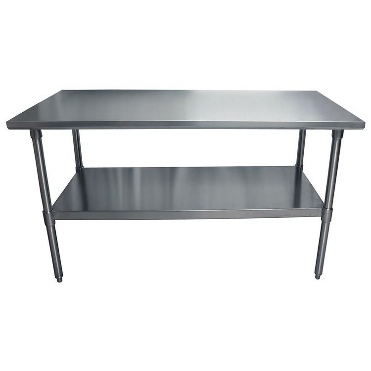 This work table features an 18-gauge T-304 stainless steel top, complete with turndown edges on all sides for added durability. Reinforced with channels, the table ensures stability and strength. It comes with an adjustable galvanized undershelf for convenient storage. The table is supported by four 1.63" diameter galvanized legs, each equipped with adjustable high-impact corrosion-resistant feet, providing a sturdy and reliable work surface. Top Color: Silver; Color Family: Silver; Base Color: Silver; Top Shape: Rectangular.