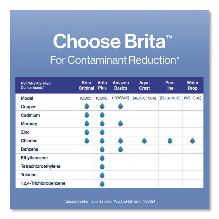 Keep tap water healthier and tasting better when you regularly change your Brita replacement filter. Made to fit all Brita pitchers and dispensers (except Brita Stream pitchers), this replacement filter reduces copper, mercury and cadmium impurities that can adversely affect your health over time, while cutting chlorine taste and odor to deliver great tasting water. Designed to leave no black flecks in your water and with no pre-soak required, the Brita filters are quick and easy to use. Change your Brita filters every 40 gallons or approximately every two months for best performance. Ideal for use in restaurants, cafeterias and other commercial facilities. Start drinking healthier, great tasting water with Brita today. Water Filters Type: Pitcher Filter; For Use With: Brita® Pitchers and Dispensers; Quantity: 3/Pack.