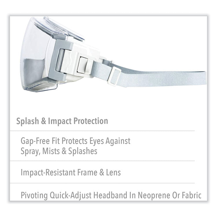 Choose a low-profile design for your eye protection. Providing unmatched protection from impacts and chemical splashes, Uvex Stealth® is one of the most popular goggles on the market thanks to its balanced approach when it comes to providing optimal eye protection with all-day wearing comfort. Toric-design polycarbonate lens provides superior optics with an unimpeded peripheral vision field. Proprietary HydroShield® Anti-Fog/Anti-Scratch coating delivers consistent condensation-free performance for much longer than average, as much as 90 times longer than the majority of anti-fog treatments on the market, while providing excellent scratch-resistance, up to twice as effective as most anti-scratch treatment alternatives. Soft, polypropylene elastomer body features MMT: Multi-Material Technology® to ensure that the goggles' body flexes to conform to your face for a secure, gap-free fit. Quick-adjust, latex-free headband helps the wearer tailor the fit to their individual needs. Goggle design accommodates easy lens replacement, and Rx inserts are available (replacement lenses and Rx inserts sold separately). Adjustability Features: Headband; Material(s): Neoprene; Polycarbonate; Polypropylene Elastomer; Antifog: Yes; Coated Lenses: Yes.