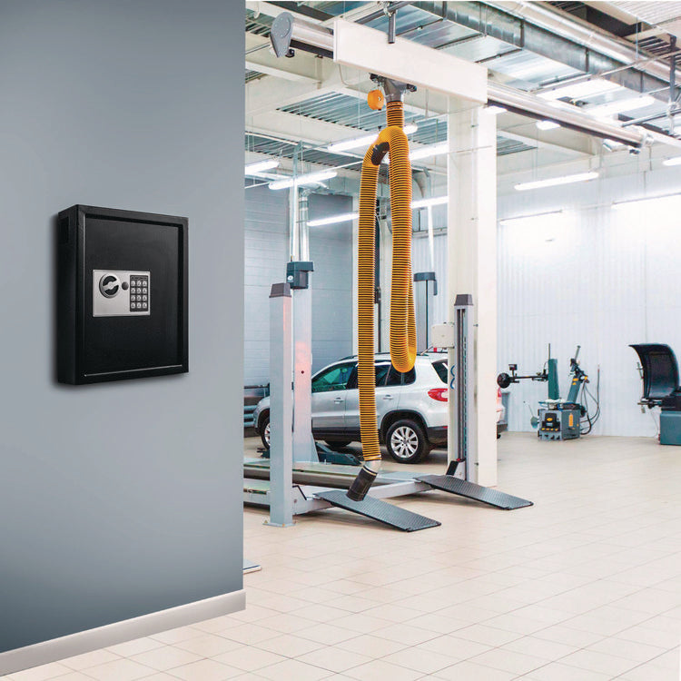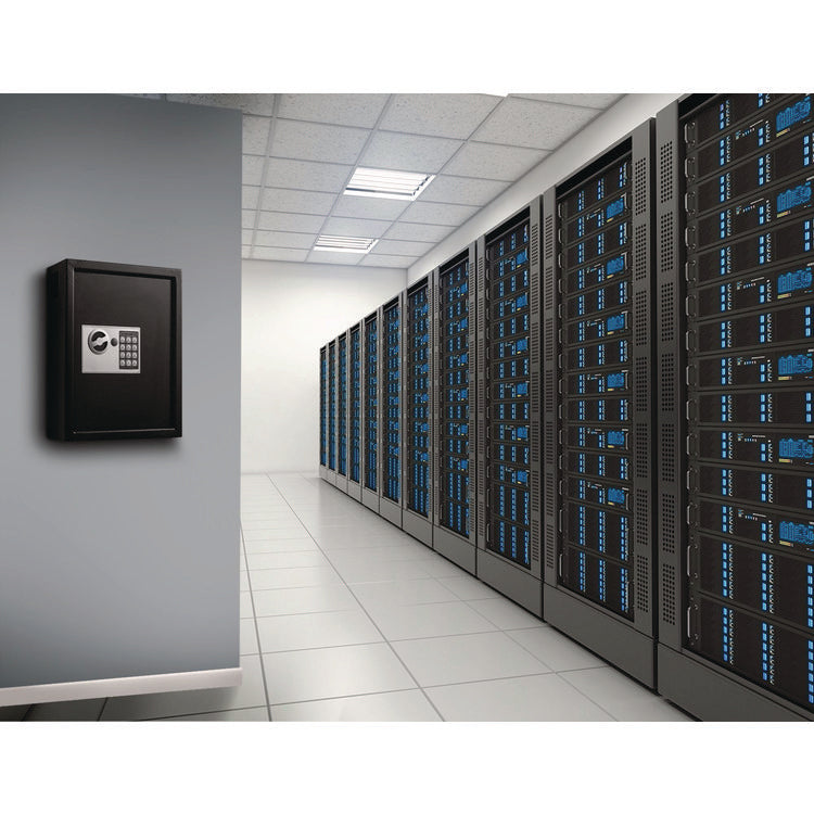 Enjoy the protection and convenience of accessing your keys through a dependable electronical lock and forget the trouble of making multiple keys. A secure solution to organize your keys in a heavy-duty steel box, easy to operate as it opens with a secret pin code that can be changed infinitely. In addition, two extra override keys are included. It is also equipped with a buzzer and LED lights in order to provide the user with the necessary feedback about each operation and power status. Key Capacity: 40; Material(s): Stainless Steel 304; Color(s): Black; Width: 13".