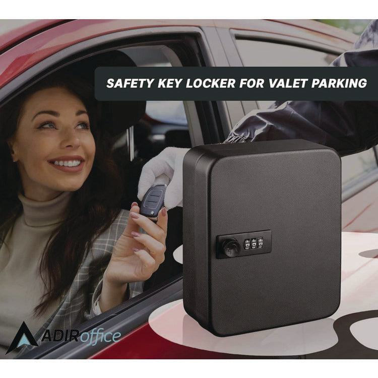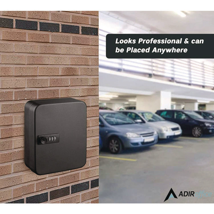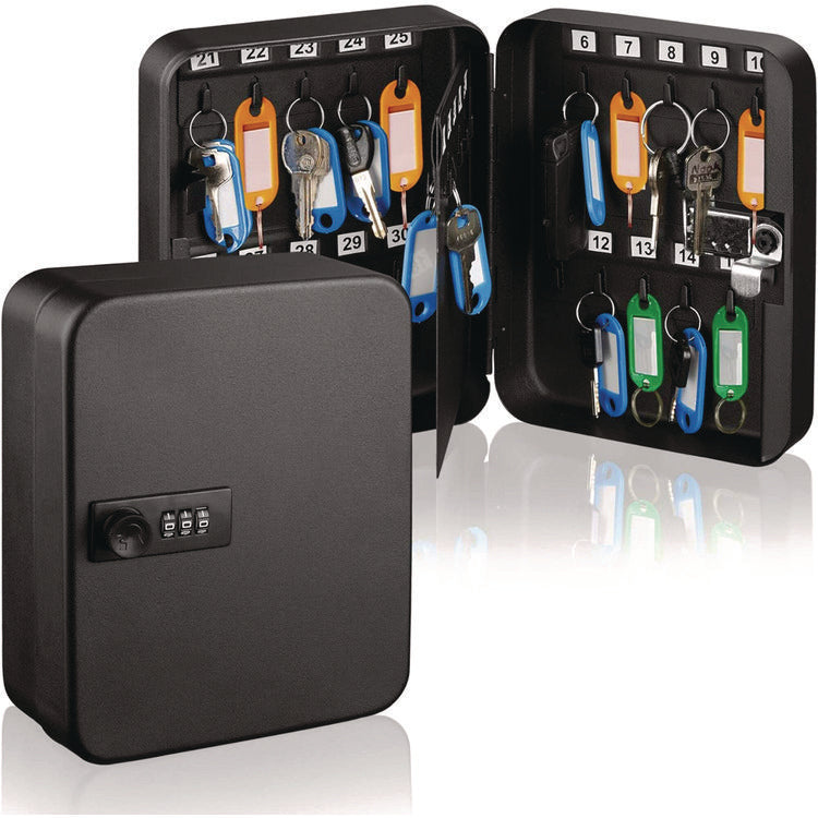 Stronger than any key cabinet in its class, this wall-mount unit is constructed from 16-gauge heavy duty steel for optimal security and durability. The cabinet holds your keys for safe storage and easy access. A combination lock provides easy access and added security and convenience. The entry code can be changed as often as you like, with over 1,000 possible combinations available, so you'll never have to re-key your lock again. A continuous piano hinge keeps the door in line with the cabinet for years of reliable use. Keys can be hung separately on hooks or with multiple keys on supplied key tags. Four-point mounting hardware and pre-drilled holes ensure easy, stable installation. Key Capacity: 30; Material(s): Stainless Steel 304; Color(s): Black; Width: 6.4".