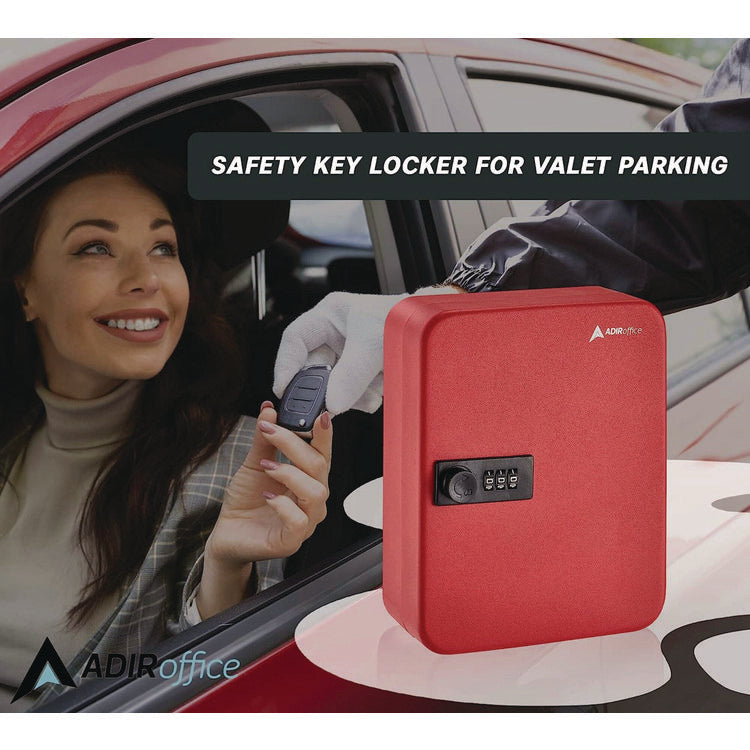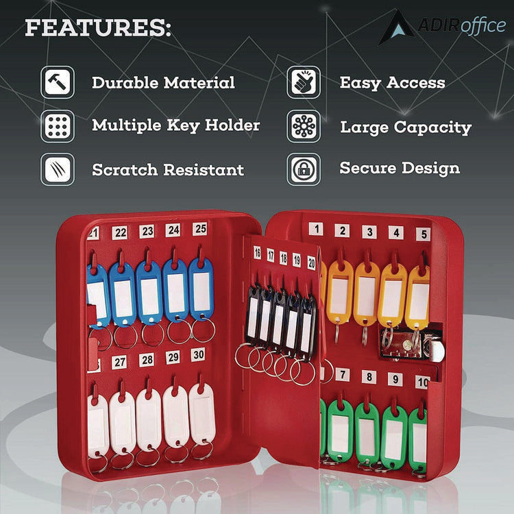 Stronger than any key cabinet in its class, this wall-mount unit is constructed from 16-gauge heavy duty steel for optimal security and durability. The cabinet holds your keys for safe storage and easy access. A combination lock provides easy access and added security and convenience. The entry code can be changed as often as you like, with over 1,000 possible combinations available, so you'll never have to re-key your lock again. A continuous piano hinge keeps the door in line with the cabinet for years of reliable use. Keys can be hung separately on hooks or with multiple keys on supplied key tags. Four-point mounting hardware and pre-drilled holes ensure easy, stable installation. Key Capacity: 30; Material(s): Stainless Steel 304; Color(s): Red; Width: 6.4".