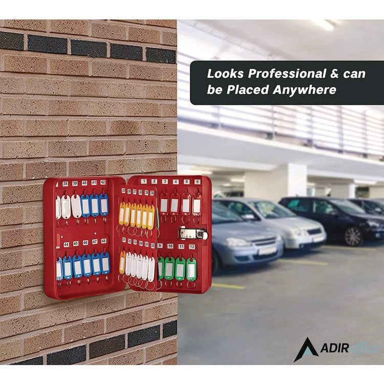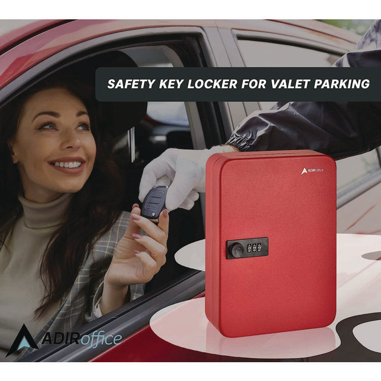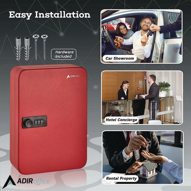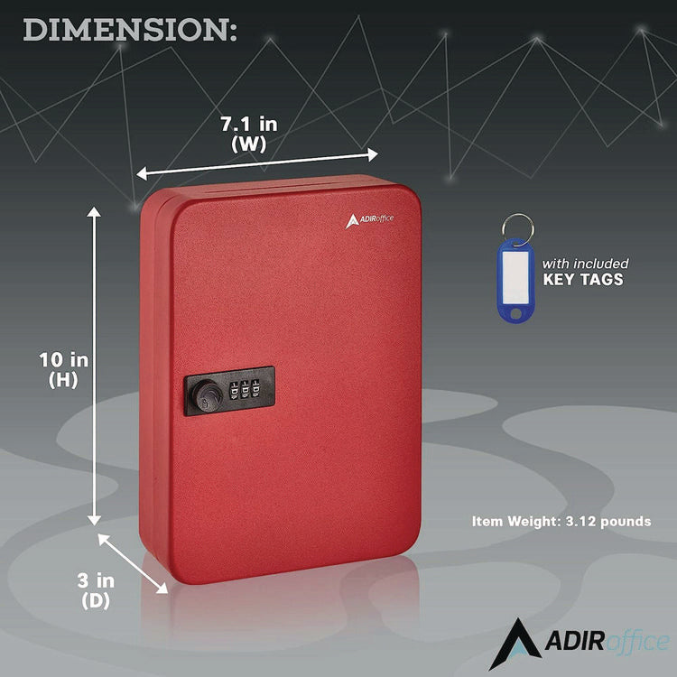 Stronger than any key cabinet in its class, this wall-mount unit is constructed from 16-gauge heavy duty steel for optimal security and durability. The cabinet holds your keys for safe storage and easy access. A combination lock provides easy access and added security and convenience. The entry code can be changed as often as you like, with over 1,000 possible combinations available, so you'll never have to re-key your lock again. A continuous piano hinge keeps the door in line with the cabinet for years of reliable use. Keys can be hung separately on hooks or with multiple keys on supplied key tags. Four-point mounting hardware and pre-drilled holes ensure easy, stable installation. Key Capacity: 48; Material(s): Stainless Steel 304; Color(s): Red; Width: 7.1".