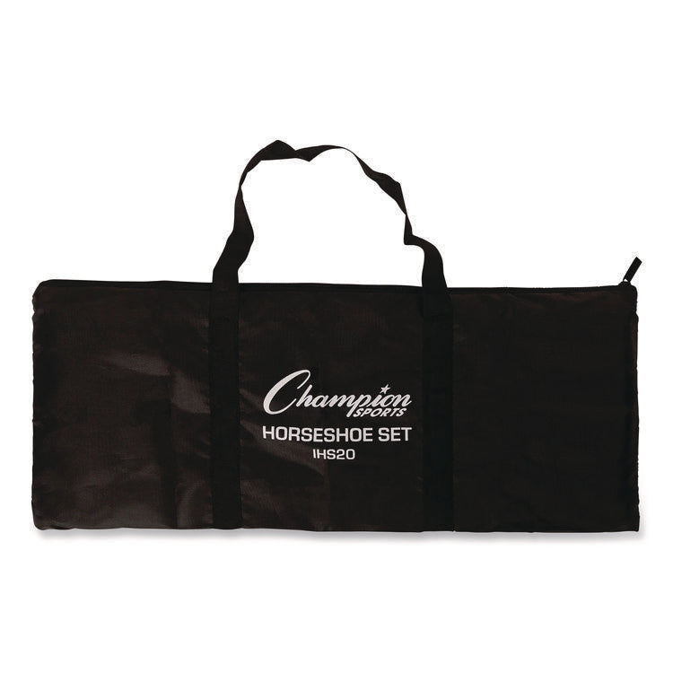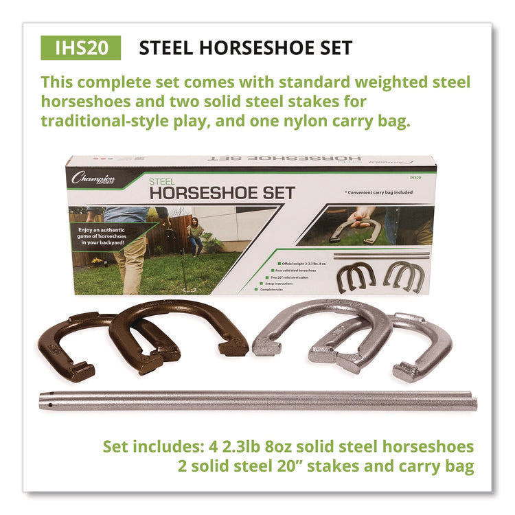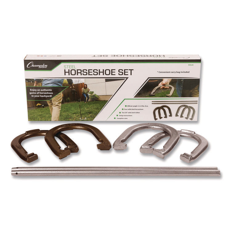 Liven up your next outdoor gathering and play an authentic game of horseshoes in the backyard or at the campsite with the Champion Sports Steel Horseshoe Set. This complete set includes standard weighted powder-coated steel horseshoes for longevity and an authentic feel, and two solid steel stakes that are easy to drive into the ground for quick setup for traditional-style play. Carry the game in the handy reusable nylon carry bag. Material(s): Steel; Playground/Gymnasium Sets Type: Horseshoe Set.