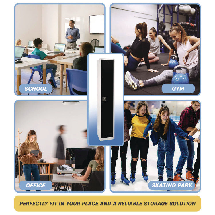 The minimalist design of our lockers makes them suitable for a wide range of spaces. Each is accompanied by coat and bag hooks which make the organization more accessible than ever, encouraging children to be responsible and independent. Additionally, the vented doors ensure proper air circulation, keeping your child's belongings fresh and dry. As a bonus, adorned on every door are metal name plates that are great for locker assignments or personalization as you see fit. Color(s): Black; Overall Width: 12"; Overall Depth: 12"; Overall Height: 72".