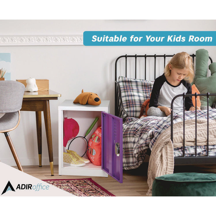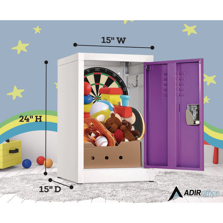 The minimalist design of our lockers makes them suitable for a wide range of spaces. Each is accompanied by coat and bag hooks which make the organization more accessible than ever, encouraging children to be responsible and independent. Additionally, the vented doors ensure proper air circulation, keeping your child's belongings fresh and dry. As a bonus, adorned on every door are metal name plates that are great for locker assignments or personalization as you see fit. Color(s): Purple; Overall Width: 15"; Overall Depth: 15"; Overall Height: 24".