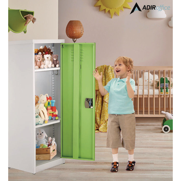 The minimalist design of our lockers makes them suitable for a wide range of spaces. Each is accompanied by coat and bag hooks which make the organization more accessible than ever, encouraging children to be responsible and independent. Additionally, the vented doors ensure proper air circulation, keeping your child's belongings fresh and dry. As a bonus, adorned on every door are metal name plates that are great for locker assignments or personalization as you see fit. Color(s): Green; Overall Width: 15"; Overall Depth: 15"; Overall Height: 48".