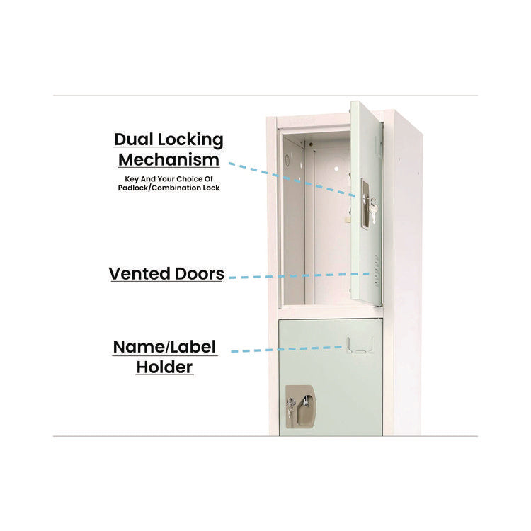 The minimalist design of our lockers makes them suitable for a wide range of spaces. Each is accompanied by coat and bag hooks which make the organization more accessible than ever, encouraging children to be responsible and independent. Additionally, the vented doors ensure proper air circulation, keeping your child's belongings fresh and dry. As a bonus, adorned on every door are metal name plates that are great for locker assignments or personalization as you see fit. Color(s): Misty Green; Overall Width: 12"; Overall Depth: 12"; Overall Height: 72".