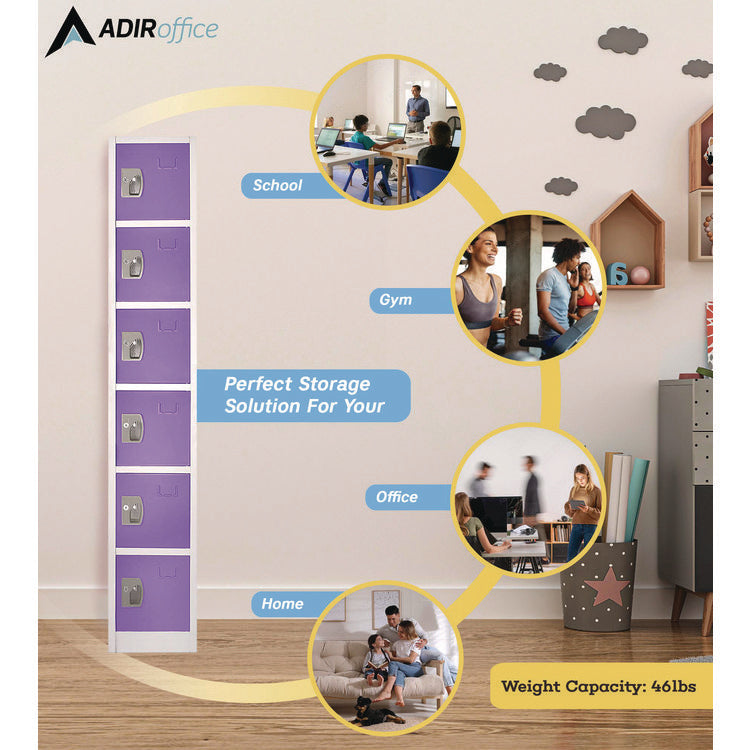 The minimalist design of our lockers makes them suitable for a wide range of spaces. Each is accompanied by coat and bag hooks which make the organization more accessible than ever, encouraging children to be responsible and independent. Additionally, the vented doors ensure proper air circulation, keeping your child's belongings fresh and dry. As a bonus, adorned on every door are metal name plates that are great for locker assignments or personalization as you see fit. Color(s): Purple; Overall Width: 12"; Overall Depth: 12"; Overall Height: 72".