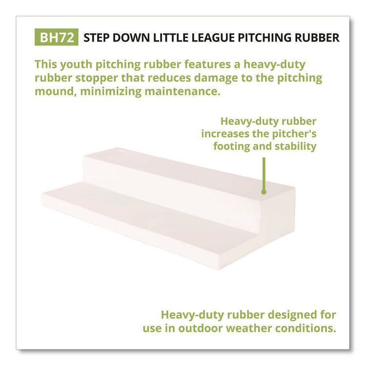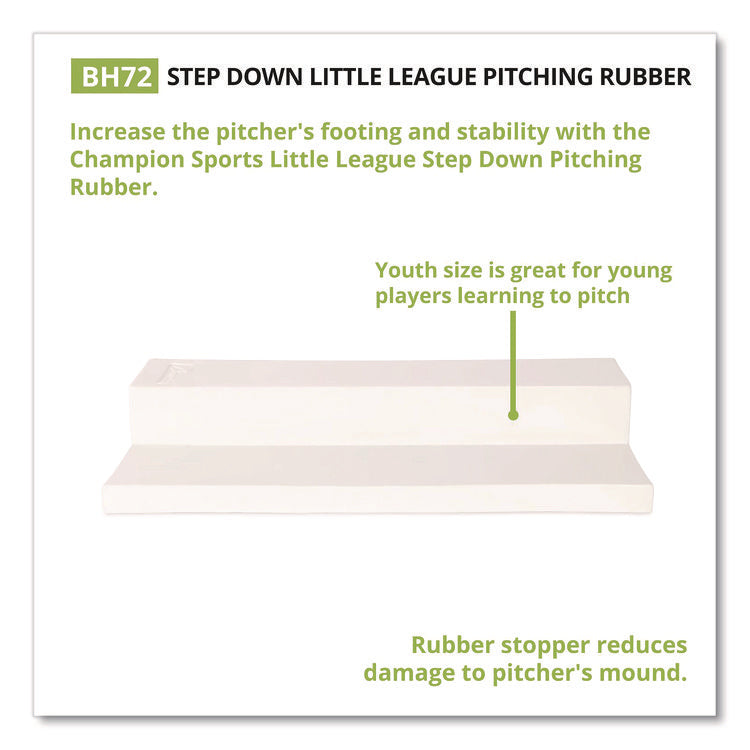 Increase the pitcher's footing and stability with the Champion Sports Youth Step Down Pitching Rubber. A perfect addition to any baseball diamond, this youth pitching rubber features a heavy-duty rubber stopper that reduces damage to the pitching mound, minimizing maintenance. As well, the youth size is great for young players learning to pitch. Length: 18"; Width: 4"; Material(s): Rubber; Playground/Gymnasium Sets Type: Step Down Pitching Rubber.
