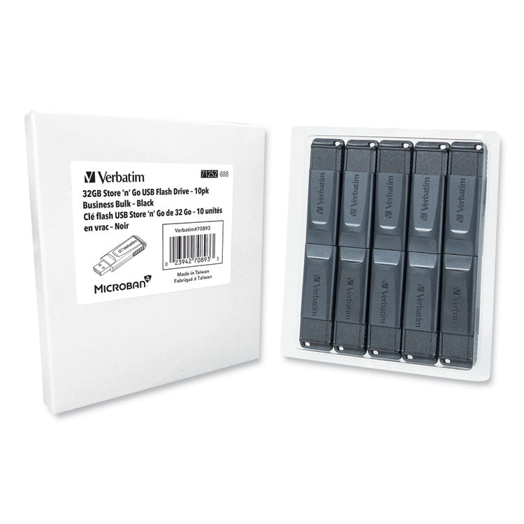 Trust your files to a Verbatim®classic! Store your data quickly and easily with Verbatim® Store ‘n' Go USB drives. With a reliable name you've come to trust, these drives let you take your data anywhere and everywhere. The convenient cap-less design with retractable housing protects the USB connector and easily slides in and out. These Verbatim® USB drives include built-in Microban® antimicrobial product protection. This antimicrobial technology helps prevent the growth of bacteria, keeping your USB drives cleaner. 10 per Pack. Connector/Port/Interface: USB 2.0; Storage Capacity: 32 GB; Weight: 0.32 oz; Operating System Compatibility: Linux®: 2.6 and Later; Mac® OS X 10.1 and Later; Windows® 7 and Later.