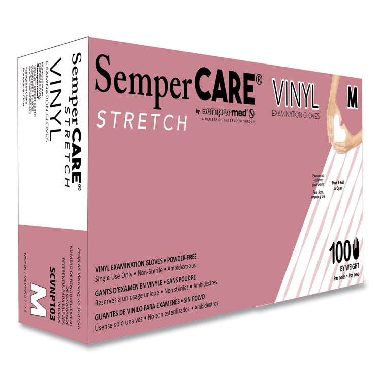 The SemperCare® Stretch Vinyl Examination glove is designed as the ultimate solution for those who are at risk of becoming sensitive to natural rubber latex. Its cream color and new resin are an upgrade from regular vinyl gloves, giving the SemperCare® Stretch Vinyl Examination glove the look and feel of latex without the latex allergens. It offers exceptional strength and protection, yet maintains maximum tactile sensitivity. At Sempermed®, we care about your comfort and protection. Recommended applications include medical, dental, vet and lab. Glove Style: Disposable; Wrist Style: Beaded Cuff; Material(s): Vinyl; Color(s): Cream.