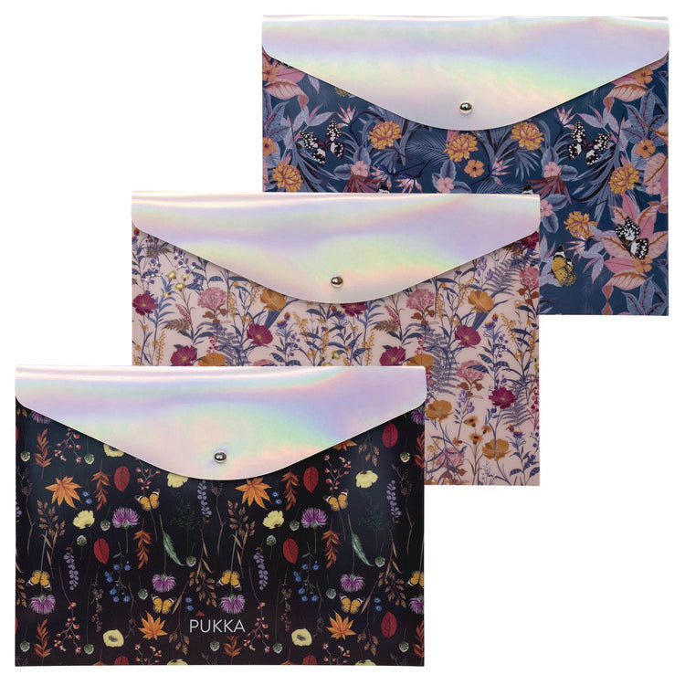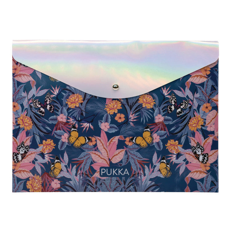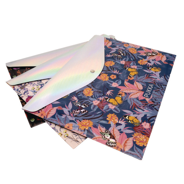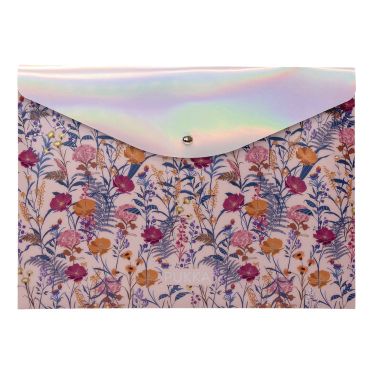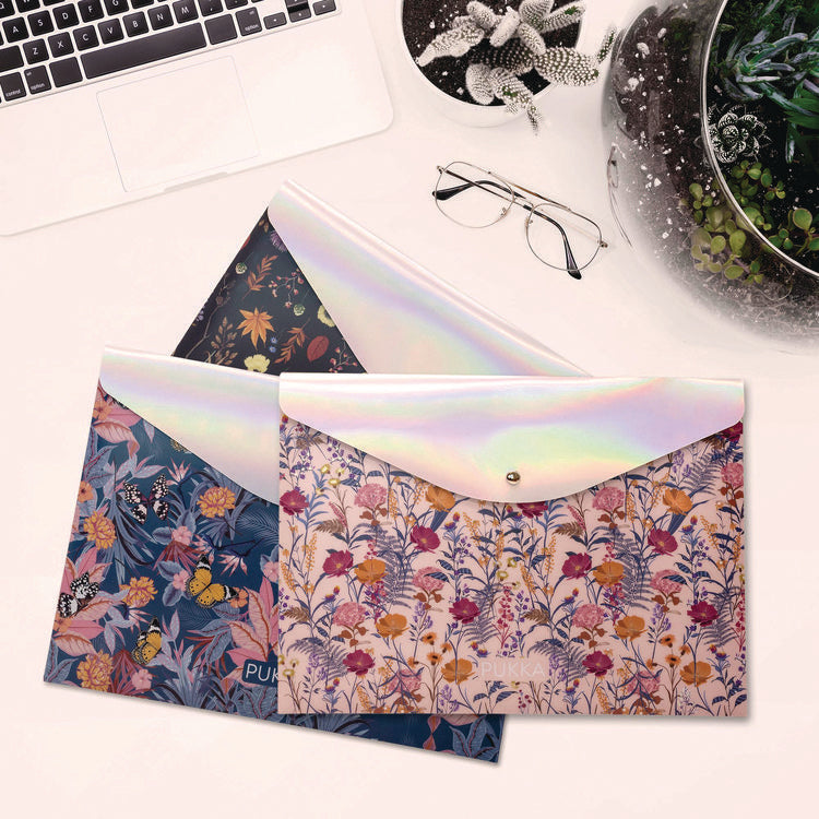 The A4 Assorted Stud Wallets are the perfect storage solution for loose documents. Amazing for teachers and school students organizing class notes and worksheets. The stud wallets are just a little bit bigger than an A4 document measuring 9.2" x 12.6", which means you will be able to place documents in perfectly. Our A4 stud wallets come in an assorted pack in the PUKKA PADS® bloom floral designs and match perfectly with the rest of the bloom Collection. People expect more from PUKKA PAD® products and that's what they get. Pocket/Wallet Type: Files/Papers; Size: A4; Overall Expansion: 2"; Closure Type: Button.