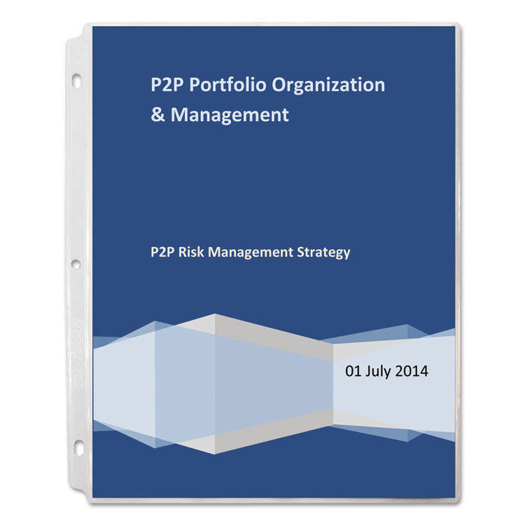 Expand the life of your documents by providing maximum durability. The thickness of these vinyl sheet protectors offers outstanding performance in preserving and protecting high-use documents, letters and reports. Uniquely shaped corners make pages easy to turn. Presentations stand out with heavy, rigid construction. No sheet punching necessary, since holders are pre-punched to fit with a standard three-ring binder. For 8 1/2" x 11" size document storage. Load Orientation: Top; Sheet Capacity: 2; Sheet Protector Type: Ring Binder; Insert Size: 8.5 x 11.