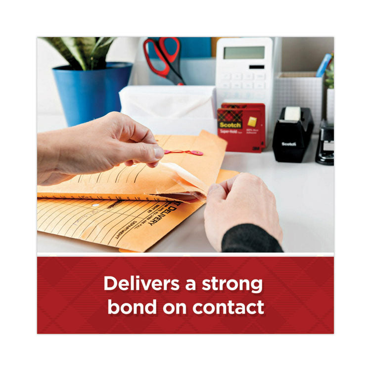 From sealing envelopes to making quick fixes on the fly, rely on the powerful bond of Scotch® Super Hold Tape. Designed with 50% more adhesive, this innovative tape offers a stronger bond than our standard transparent tape (Versus Scotch® Cat. 157 Transparent Tape). The thicker backing delivers outstanding durability when a secure, lasting hold is essential. Virtually crystal clear, this tape holds strong without standing outperfect for repairs, mounting, crafts and more. The convenient dispenser fits comfortably in your hand and lets you unroll and cut your desired amount with ease. Whether you're concealing confidential documents, sealing a small care package, trust what matters to you to the superior adhesion of Scotch® Super Hold Tape. Grade: Super-Hold; Core Size: 1"; Dispenser Included: No; Adhesive Material: Synthetic Acrylic.
