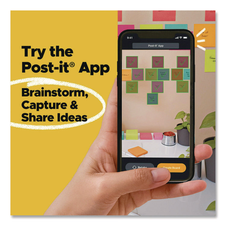 Experience the power of 2X stickiness. Super Sticky Notes stick to practically everything, everywhere! Revolutionary technology ensures your notes will stick securely to most surfaces yet remove cleanly! Versatile and essential, they're the perfect solution for lists, reminders, color-coding, labeling, brainstorming, storyboarding and even mural art. As they adhere firmly to walls, windows, doors, worksurfaces, mirrors and more, you can stick and restick these classic Canary Yellow notes wherever they're most likely to be noticed. To enhance your note-taking experience, download the free Post-it® App to your smartphone or tablet and instantly capture, save and share your important notes. Self-Stick Pad Type: Super-Sticky; Shape: Square; Color(s): Canary Yellow; Color Family: Yellow.