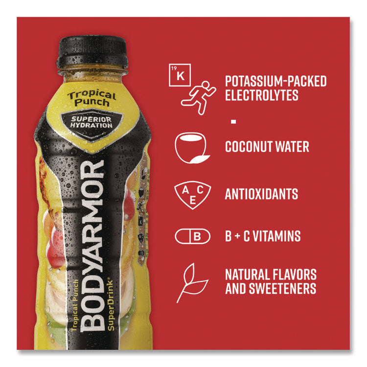 BodyArmor is a premium sports drink that provides superior hydration. It is packed with electrolytes, coconut water, and vitamins and is low in sodium and high in potassium. Beverage Type: Flavored Sports Drink; Flavor: Tropical Punch; Product Packaging: Bottle; Volume Capacity: 16 oz.