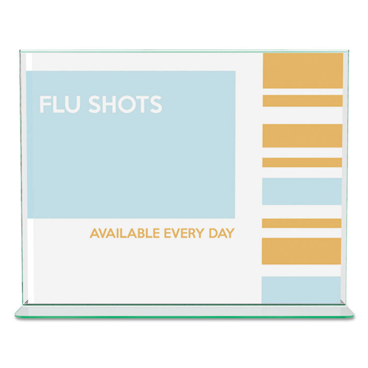Display your message in style with this premium green-edge sign holder. Sleek design provides a glass-like appearance with smooth, rounded, green-tinted edges that enhance your insert. Lightweight and durable with easy side- and bottom-loading capabilities to quickly change out your sign. Great for displaying high-end signage, awards or certificates. Clear viewing panels from both sides offer full visibility and protects inserts from damage. Accommodates 8.5" x 11" inserts. Frame Color: Clear; Size: 11.06 x 3.34 x 8.75; Message(s): Customizable; Insert Size: 11 x 8.5.