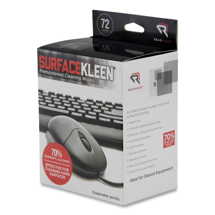Effectively clean hard surfaces with Read Right SURFACEKLEEN Pre-Moistened Cleaning Wipes. Formulated with 70% IPA to clean most hard nonporous surfaces and evaporates quickly, leaving nearly zero oil traces. Safe for use on most smartphones and tablets. Towel/Wipe Type: Delicate Task Wipe; Application: General Purpose; Applicable Material: Ceramic; Glass; Metal; Nonporous Hard Surfaces; Color(s): White.
