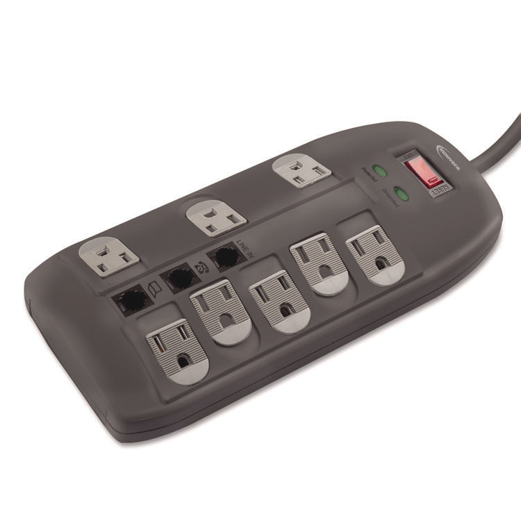 Keep your computer peripherals and other electronic equipment safe with this eight-outlet surge protector. Phone line connectors protect modem, fax and other telecommunication accessories from surge damage. MOV surge mechanism is fire-resistant for added protection in the event of an extreme surge. Three wide-spaced outlets allow you to use transformer plugs without blocking the other outlets. Child-resistant sliding covers close off unused outlets. Number of Outlets: 8 AC; Joules Of Surge Protection: 2,160 J; Lines: 3; Multimedia Protection: Tel/DSL.