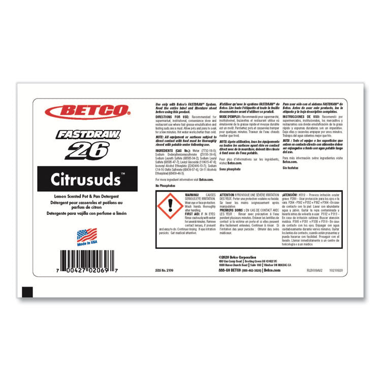 A heavy-duty lemon scented pot and pan detergent ideal for cleaning pots, pans and dishes in commercial use. This product works quickly and leaves surfaces spot and film free. Citrusuds is made from the best surfactants and rinses quickly and easily. Effective on grease and fat, yet gentle on the hands. Always put detergent in sink first and permit water to flow on it. Application: Hand Dishwashing; Applicable Material: Pans; Pots; Chemical Compound: Sodium Dodecylbenzenesulfonate; Dirt Types: Fats; Grease; Oils.