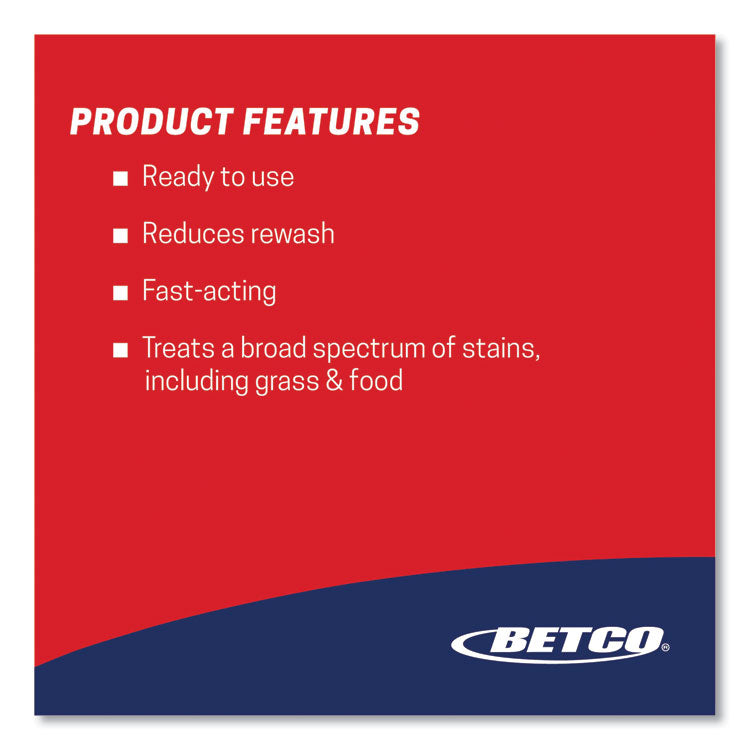 Ready-to-use broad spectrum prewash spotter is effective on food soil, ink, grass, and cuff and collar stains. Formulated with naturally occurring solvents, PRO A works quickly to ensure one wash cleaning. When used as directed and in accordance with Betco's Best Laundry Practices wall chart, Pro A will save time, energy, and labor costs. This product reduces chemical consumption and produces clean results in one wash. PRO A is part of Betco's LaundryPro Stain Treatment Center. Application: Laundry Pretreatment; Applicable Material: Fabric; Chemical Compound: Glycerin; Dirt Types: Food; Grass; Soil; Stains.
