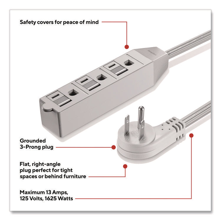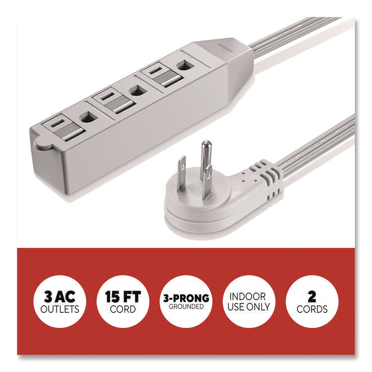 Stay powered up and plugged in with our 3-outlet power strip. The generous 15-foot cord lets you power items throughout your workspace, no matter how forgotten the corner. Each outlet in the strip is grounded with a three-prong plug for safe connections, and plastic safety covers add an extra layer of protection to keep fingers and office accessories from plunging in. This extension cord is designed for indoor use, in dry areas. This extension cord is equipped with two cords and a flat, right-angle plug, making it easy to use in tight spaces or behind sofas or bookshelves. With a maximum capacity of 13 Amps, 125 Volts, and 1625 Watts, it's made for lighter-duty jobs like powering light fixtures or lamps. Its sturdy 16-gauge construction combines flexibility and durability, so you get reliable power when you need it. Application: Indoor; Cable Length: 15 ft; Number of Outlets: 3; Number of Prongs: 3.