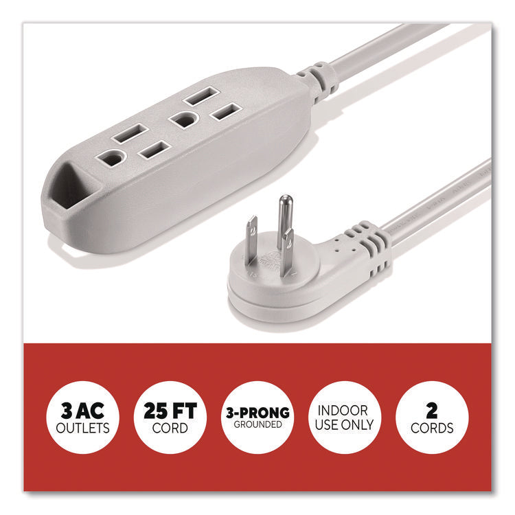 Keep the power flowing with twice the confidence using these versatile extension cord boasting three AC outlets and extended reach thanks to 25-foot cords. The flat, right-angle plug lets you place the power strip wherever you need without worrying about cumbersome furniture, awkward corners or tight spaces. Both of the included strips are grounded with three prongs for safety, and designed for indoor use in dry areas. The maximum capacity of 13 Amps, 125 Volts, and 1625 Watts, makes it perfect for lighter duty items like lamps, laptops or chargers. The extension cords will be your go-to solution for reliable energy no matter what kind of space you're powering. Application: Indoor; Cable Length: 25 ft; Number of Outlets: 3; Number of Prongs: 3.