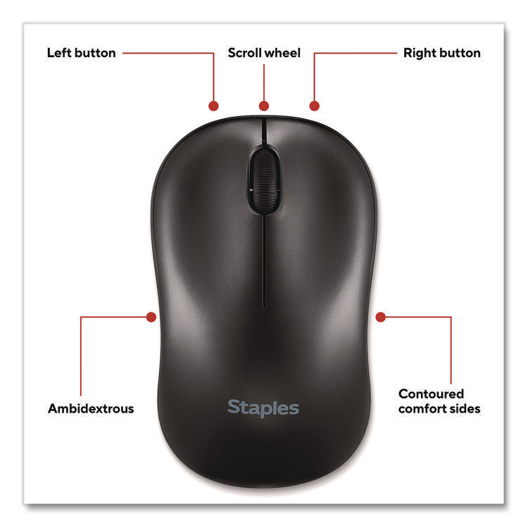 TECH Wireless Ambidextrous Optical USB Mouse, 2.4 GH Frequency, 33 ft Wireless Range, Left/RIght Hand Use, Black