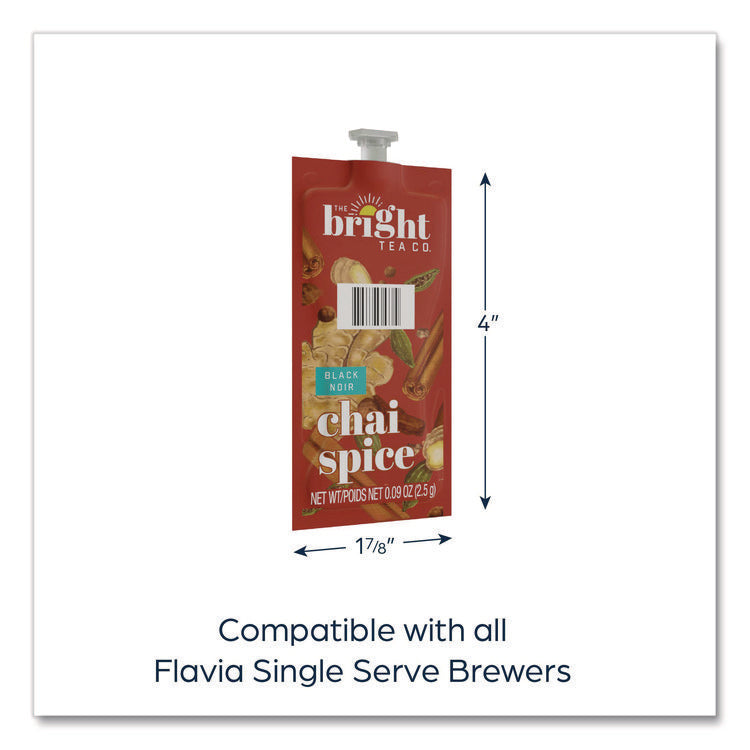 The Bright Tea Co.® Chai Spice features bright black tea with notes of ginger, cinnamon, black pepper, and cardamom. It is best served sweetened as a latte. Our brewing process, where nothing touches the ingredients other than hot water, ensures your drink does not taste like previous brews. Compatible with FLAVIA® single-serve brewers. For single-serve sustainability, innovative pouches are 100 percent recyclable through Terracycle. Beverage Type: Tea; Flavor: Chai Spice; Product Packaging: Pouch; Capacity (Weight): 0.09 oz.