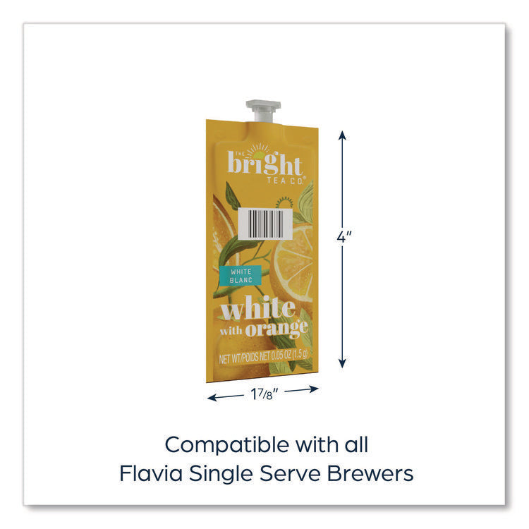 The Bright Tea Co.® White with Orange Tea Freshpack offers a smooth and subtle orange flavor and aroma. Our brewing process, where nothing touches the ingredients other than hot water, ensures your drink does not taste like previous brews. Compatible with FLAVIA® single-serve brewers. For single-serve sustainability, innovative pouches are 100 percent recyclable through Terracycle. Beverage Type: Tea; Flavor: White with Orange; Product Packaging: Pouch; Capacity (Weight): 0.05 oz.