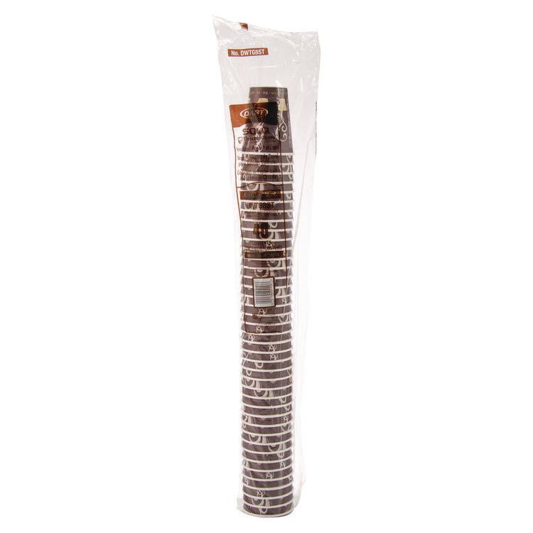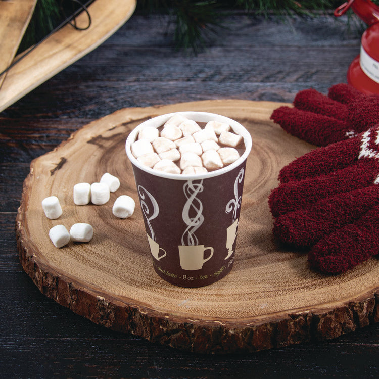 Enjoy your drink without inconvenienceinsulated, double wall paper cups eliminate the need for a cardboard sleeve. Insulating air channels reduce heat transfer, keeping the sidewall cool to the touch. The upscale coffee-themed design is perfect for any cafe or restaurant. Thermotouch insulation maintains beverage temperature. Convenient, leak-proof corresponding lids, for drinking on the go (sold separately). Four cup sizes share one lid. Cup Type: Hot Cup; Interior Volume Capacity: 8 oz; Material(s): Double-Walled Paper; Material Type: Paper.