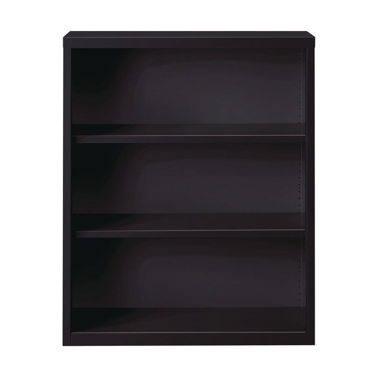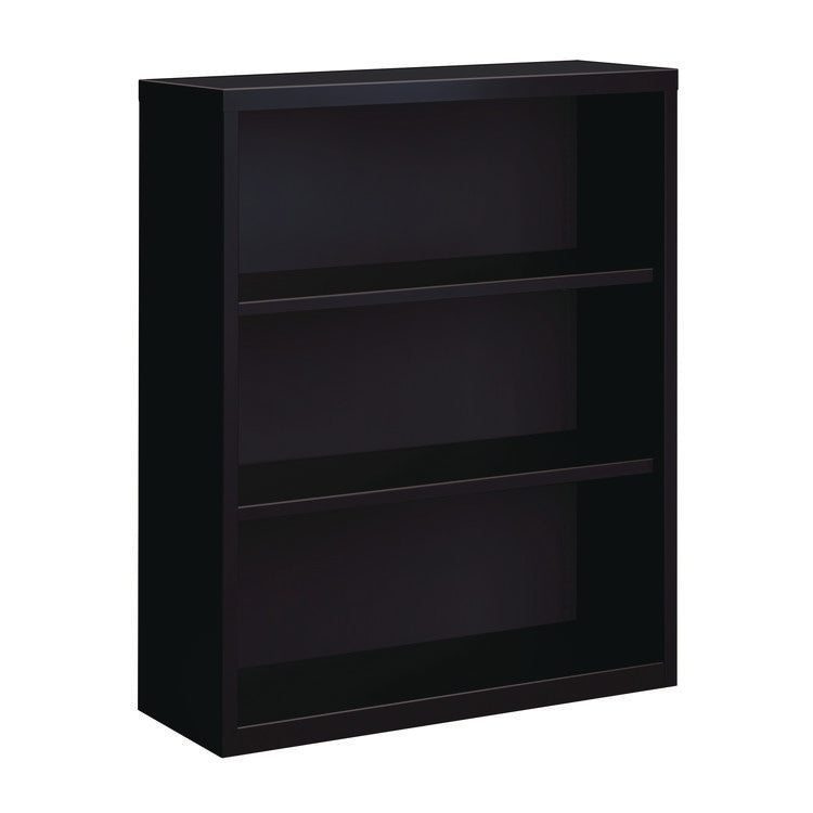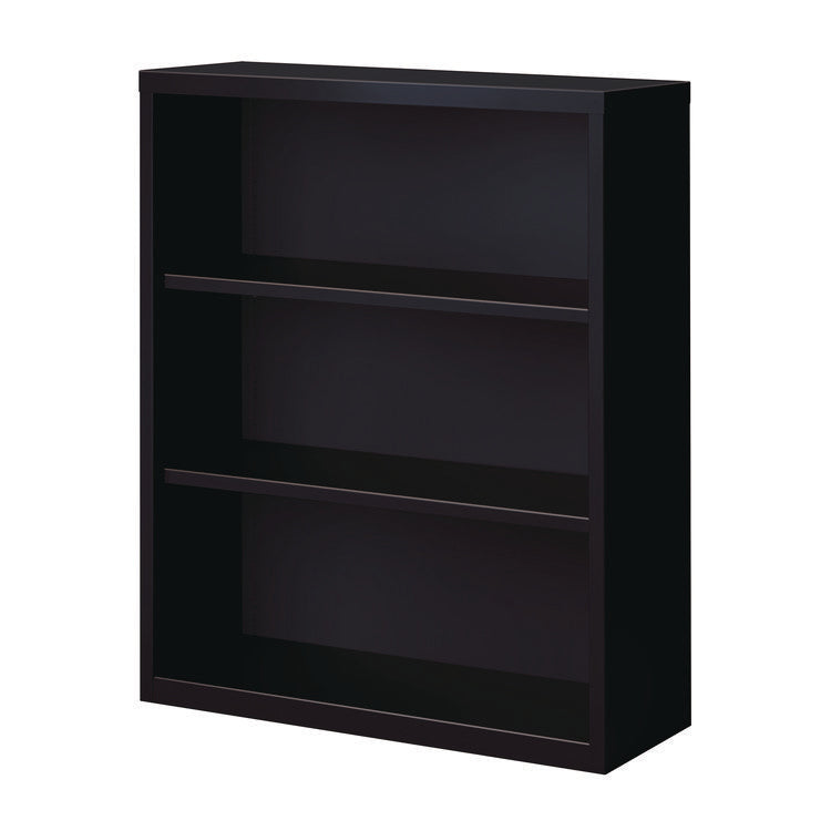Make a statement with Alera® Three-Shelf Metal Bookcases. Featuring durable, fully welded steel construction and attractive, easy to clean, baked-enamel non-porous surfaces, these bookcases are perfect for your home, office, school and library needs. Providing smart and stylish organization, the middle shelves are adjustable in one-inch increments to accommodate the books and materials you wish to keep close, and the fixed bottom shelf helps ensure solid stability. Create the perfect shelf space to meet your needs while you keep clutter at bay. Color(s): Black; Color Family: Black; Material(s): Steel; Number of Shelves: 3.