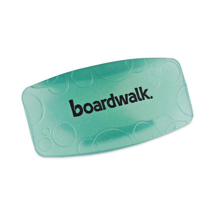Boardwalk® Bowl Clip is a discreet way to freshen washrooms and mask unpleasant bathroom odors. Built with a thoughtful design that securely locks into place on the toilet seat. The unseen clip gradually releases a pleasant air freshener scent for 30 days. Made from a unique patent pending material that contains more air freshener than standard rimsticks. Will not dissolve in or pollute water. Deodorizer Type: Toilet Bowl Clip; Scent: Cucumber Melon; Color(s): Green; Quantity: 12/Box.
