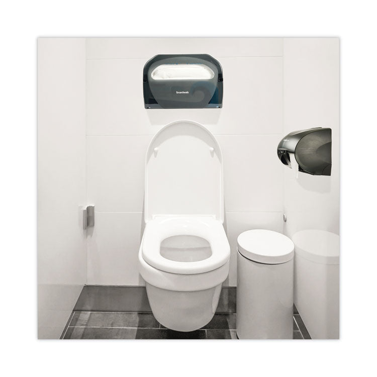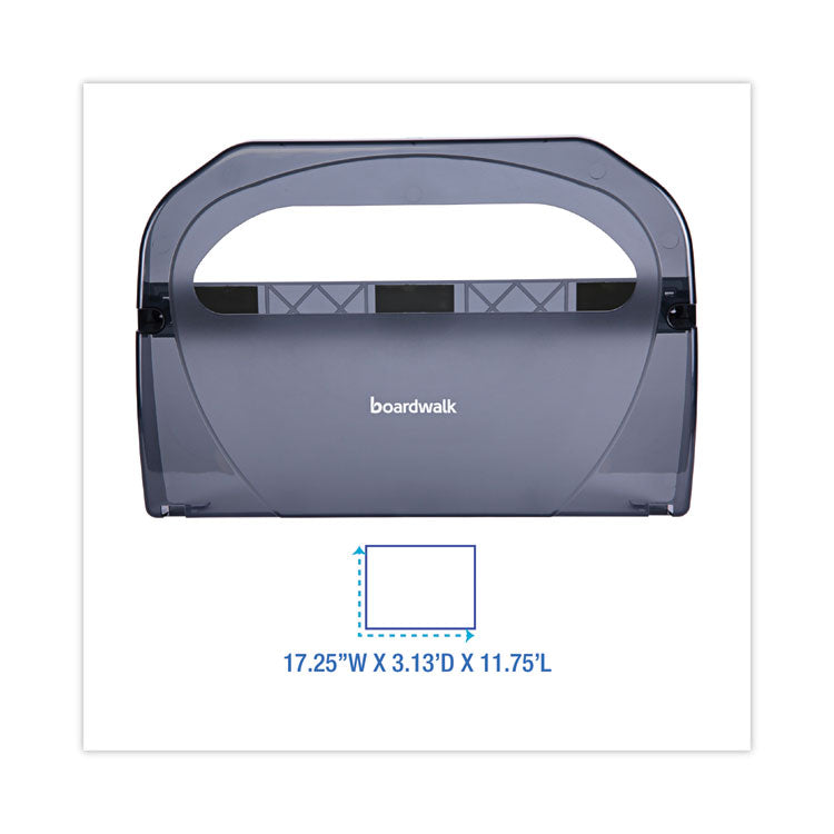 Boardwalk® Toilet Seat Cover Dispenser is a sturdy dispenser that provides customers with a more sanitary restroom. Mounts to the wall so the covers can be grabbed individually, and the box stays off the floor. Access to toilet seat covers prevents waste, eliminating the need to create makeshift covers from paper towels or toilet tissue. Toilet seat cover dispensers provide an economical restroom solution. Seat covers are sold separately. Holds: One Standard Pack; Material(s): Plastic; Color(s): Smoke Black; Mounting Details: Wall.