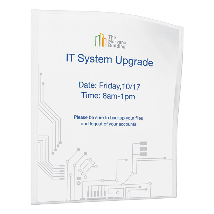 Keep your signs looking clean and sharp for as long as they're posted with these Removable Display Protectors. Durable material ensures that your signs and other posted information look as good as new even after they've been hanging around for a while. Each display protector features two strips of removable adhesive that allow you to affix your display firmly and remove it easily without damaging the surface. The acid-free and archival-safe material won't lift print from your papers for a view that stays diamond clear. With these self-adhesive sheet protectors, all signs point to success. Load Orientation: Top; Sheet Capacity: 20; Sheet Protector Type: Display; Insert Size: 8.5 x 11.