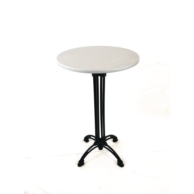 Our topalit tables are produced using responsible manufacturing practices. When you choose our tables, you're not just investing in your restaurant; you're making a sustainable choice for our planet. Table tops are weather-, UV- and scratch-resistant. They are also -heat resistant up to 356°F and tough against temperature fluctuations. Tops are unbreakable and impact resistant, capable of standing up to the roughest of treatments and making these tables the perfect choice for outdoor dining. Top Color: Brushed Silver; Color Family: Silver; Base Color: Black; Top Shape: Round.