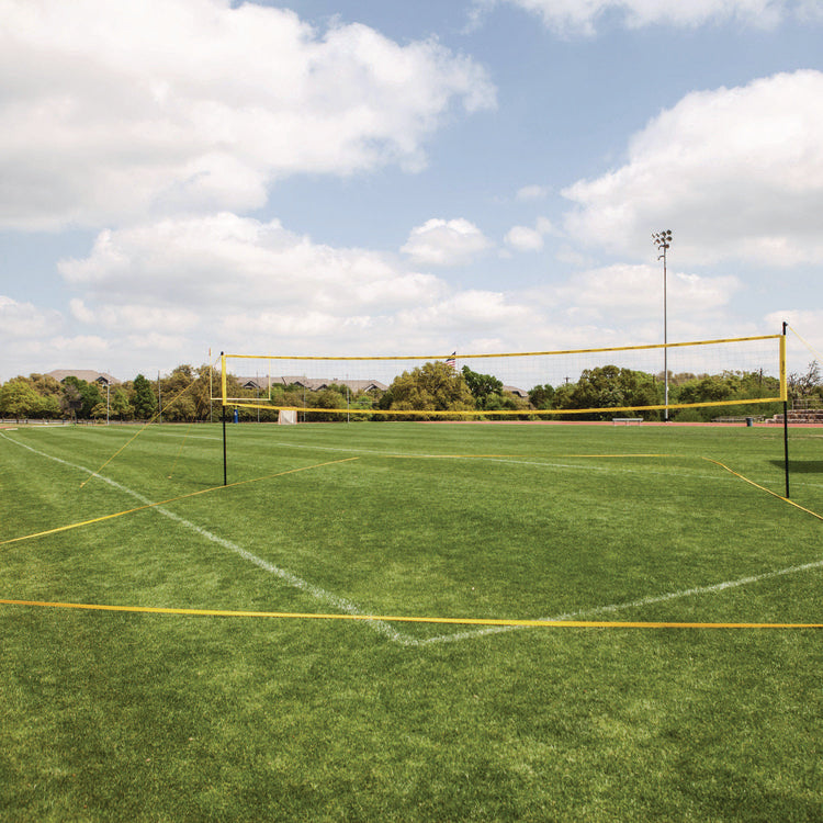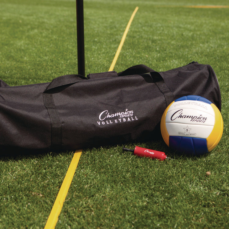 Set up your next volleyball tournament in a flash with this Champion Sports Tournament Series Volleyball Ball Set. Designed to last, the durable powder-coated aluminum poles are strong enough to endure even the most intense smashes and the high-quality mesh net features sturdy tarpaulin tapes to help it stand up to the elements outdoors. The volleyball set contains everything you need to start playing, including a premium quality volleyball and a pump to keep it inflated between matches. The whole set also packs away neatly into a weather-resistant carrying case for easy transportation and storage. Material(s): Aluminum; Playground/Gymnasium Sets Type: Volleyball Set.
