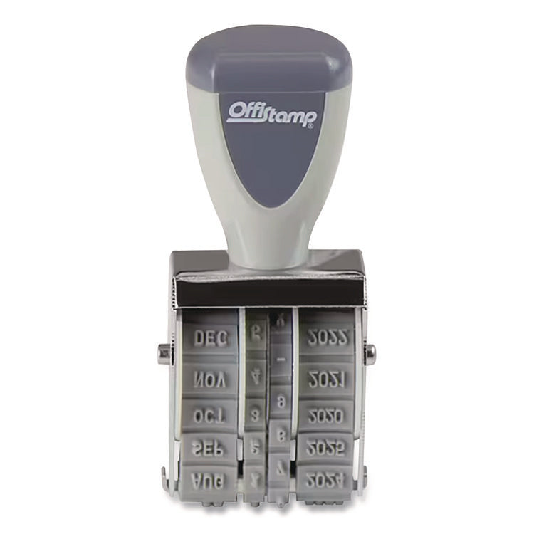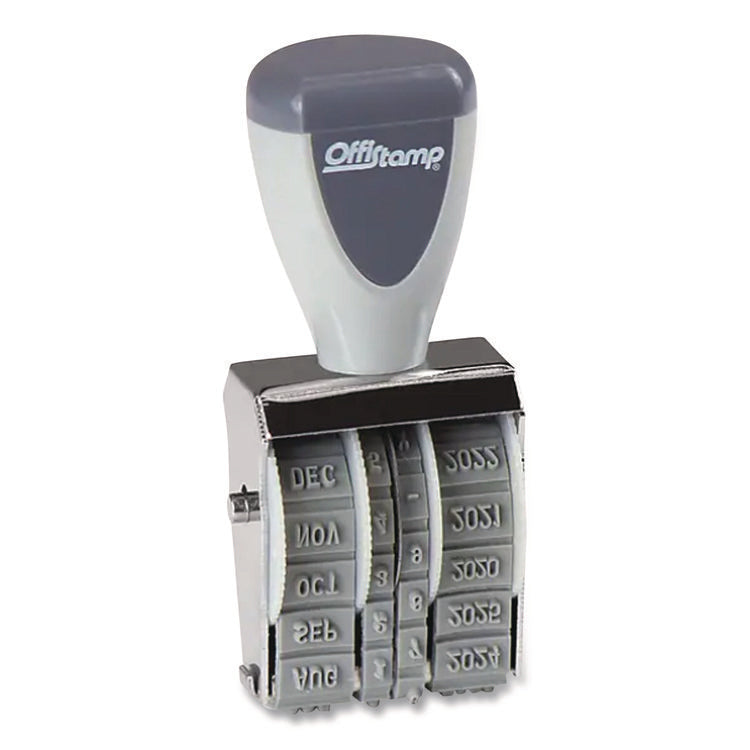 Save time—stamp rather than write the date on your important documents. Easy-to-rotate month, day and year wheels make it easy to get everything just right each and every day. Round, ergonomic plastic handle allows you to get a comfortable grip. Durable steel frame. Stamp Type: Dater; Ink Types: Conventional; Number of Lines: 1; Impression Width: 1.25".